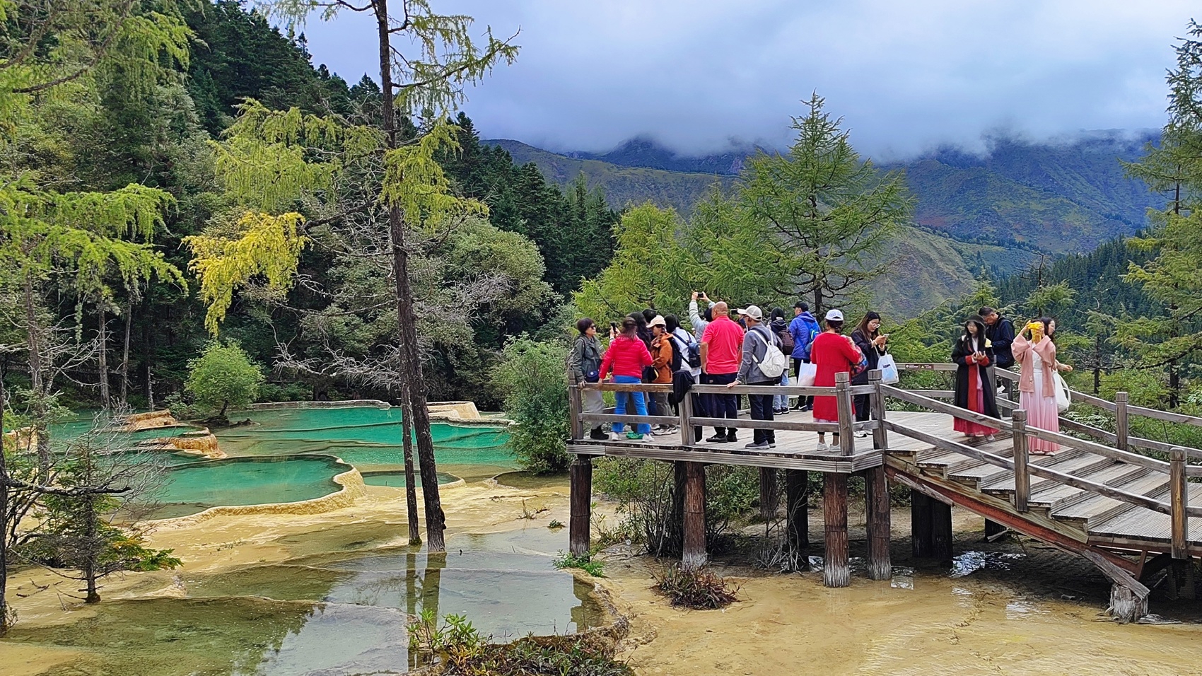 四川在线记者9月21日在黄龙景区看到,有不少游客带着孩子在各处景点打卡。黄龙景区管理局市场营销处相关负责人告诉记者,往年暑假之后到国庆黄金周期间,属于“小淡季”。但川青铁路通车后,一家人一起到景区的“周末游”在增多。加上老年游客的增多,传统淡季已不再淡。