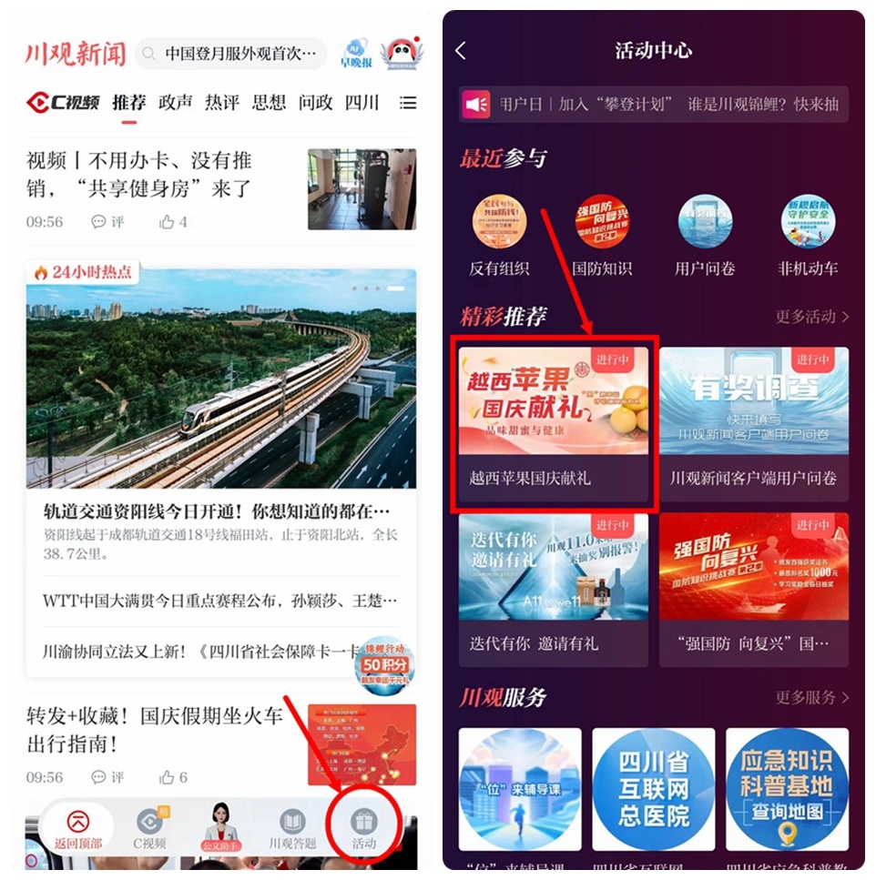 方式二:在川观新闻首页,点击右下角“活动”,进入“活动中心”,找到“越西苹果国庆献礼”积分抽奖活动图片点击参与活动即可参与;
