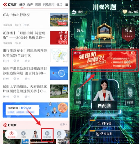 在川观新闻首页,点击下方“川观答题”,找到“强国防 向复兴”国防知识挑战赛第2季活动图片,点击即可参与活动;