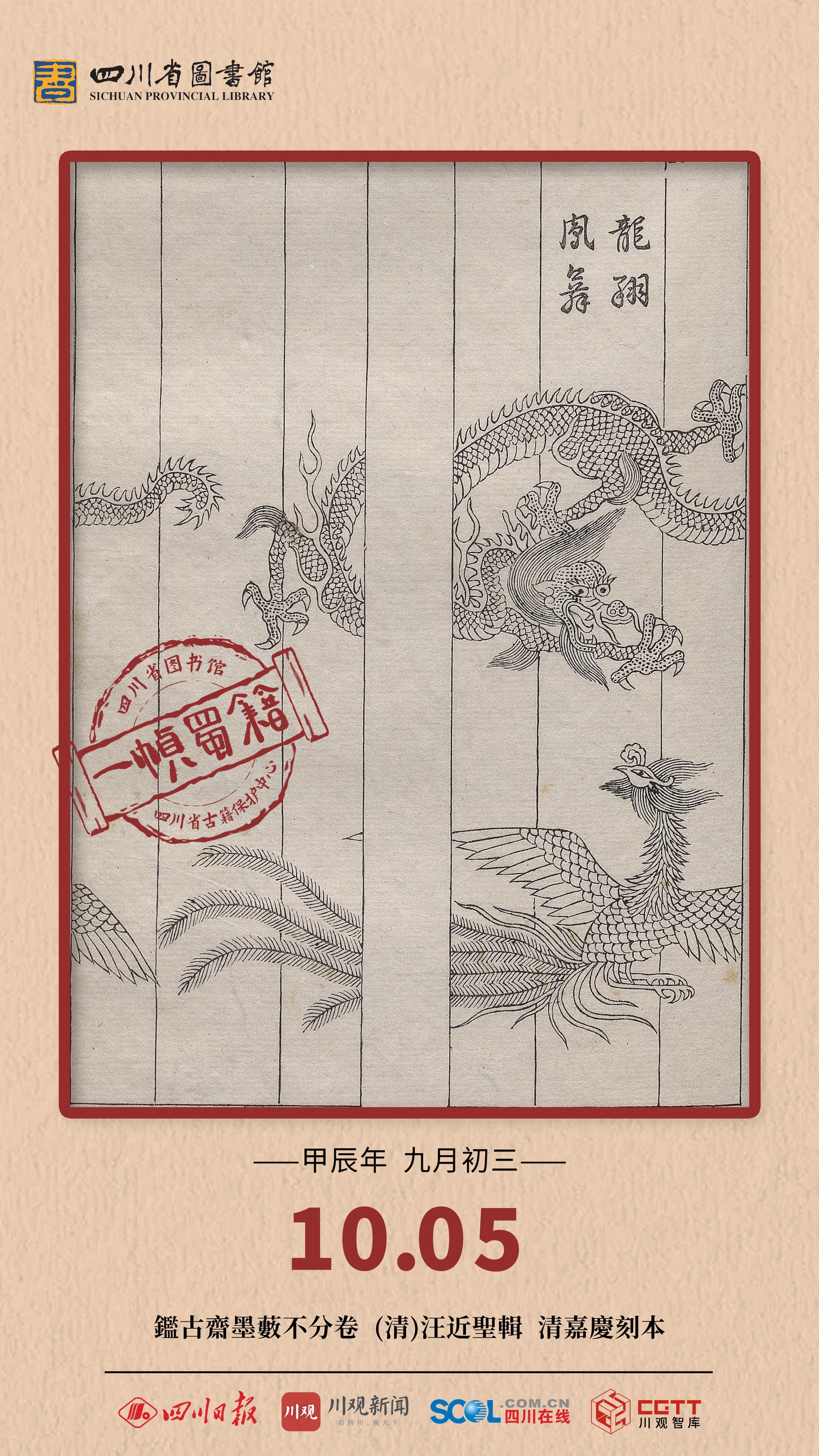 10月5日,一帧蜀籍邀您欣赏汉族传统吉祥图案“龙翔凤舞”,该图案常用于表达对国家繁荣、人民安乐的祈愿。海报图选用的版本为鉴古斋墨薮不分卷(清)汪近圣 辑 清嘉庆刻本。