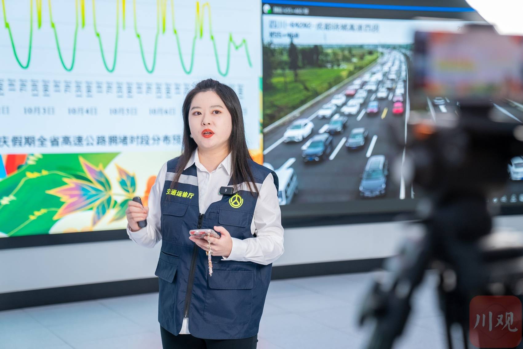 10月5日,四川在线记者来到四川省交通运输运行调度中心,见到了正在进行路况直播的工作人员——洪宇箫。她正站在监控大屏前,与后方配合画面调度的同事们进行直播。直播间里,询问路况的评论快速划过,有网友等到答案就离开直播间,也有网友继续评论分享自己的假期出行经验。