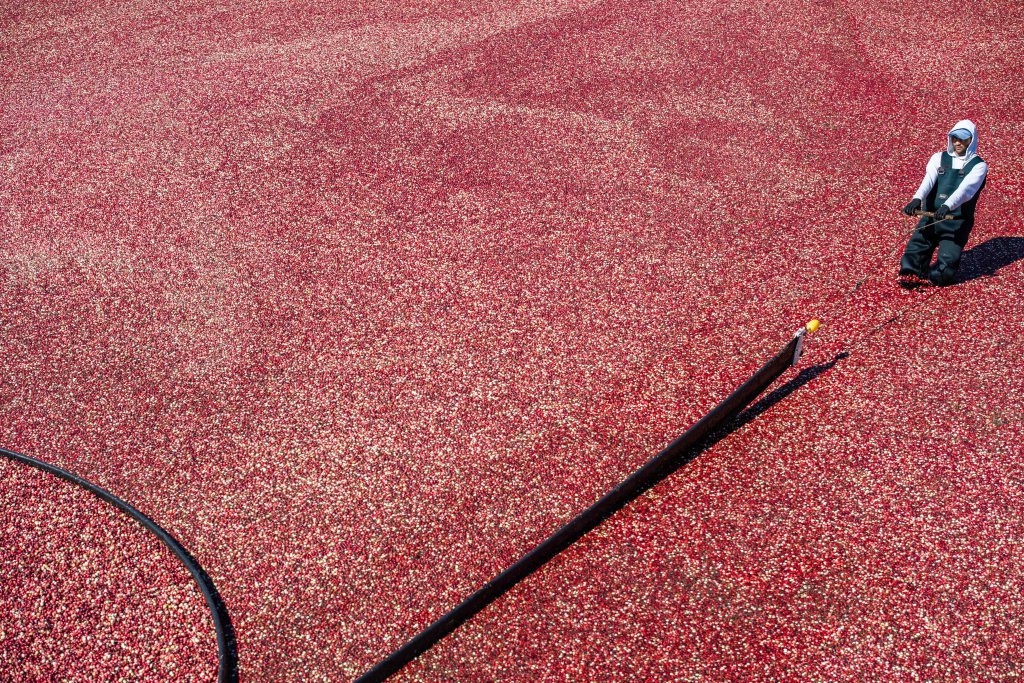 10月8日,在美国马萨诸塞州卡弗,农场工人收获蔓越莓。