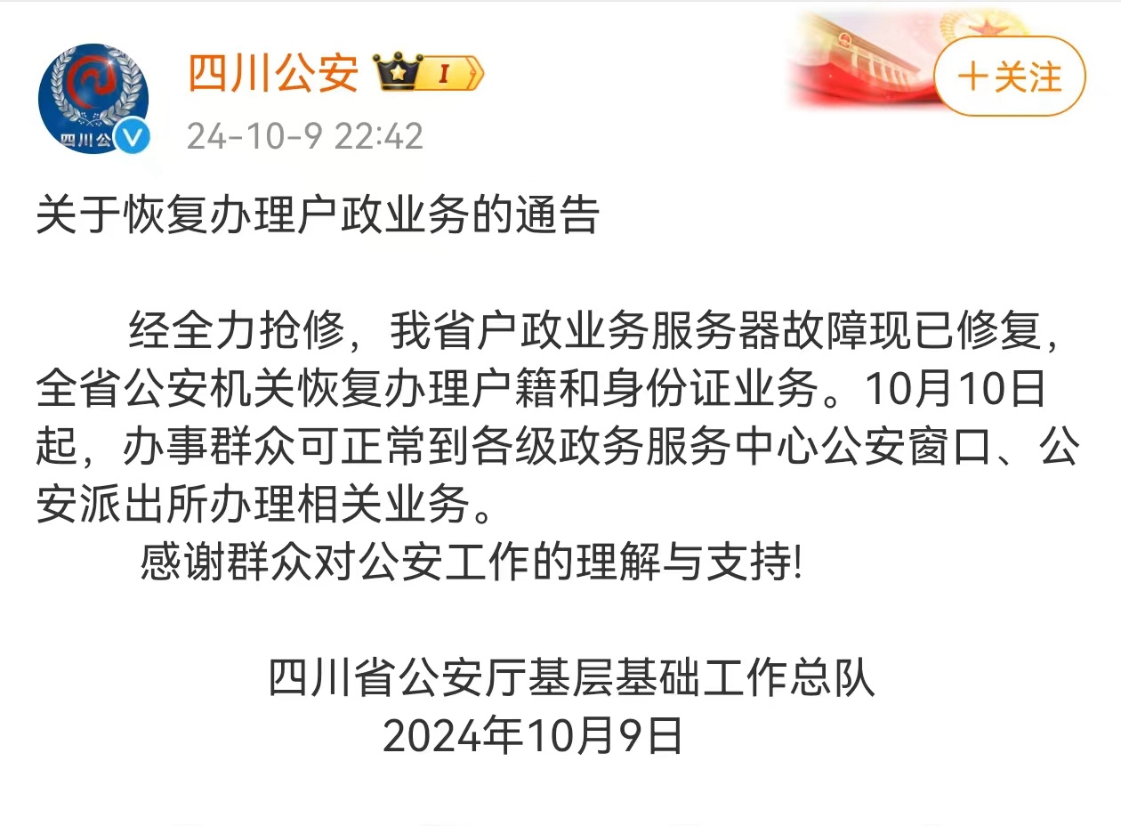 今(9日)晚,@四川公安 发布消息,经全力抢修,我省户政业务服务器故障现已修复,全省公安机关恢复办理户籍和身份证业务。10月10日起,办事群众可正常到各级政务服务中心公安窗口、公安派出所办理相关业务。