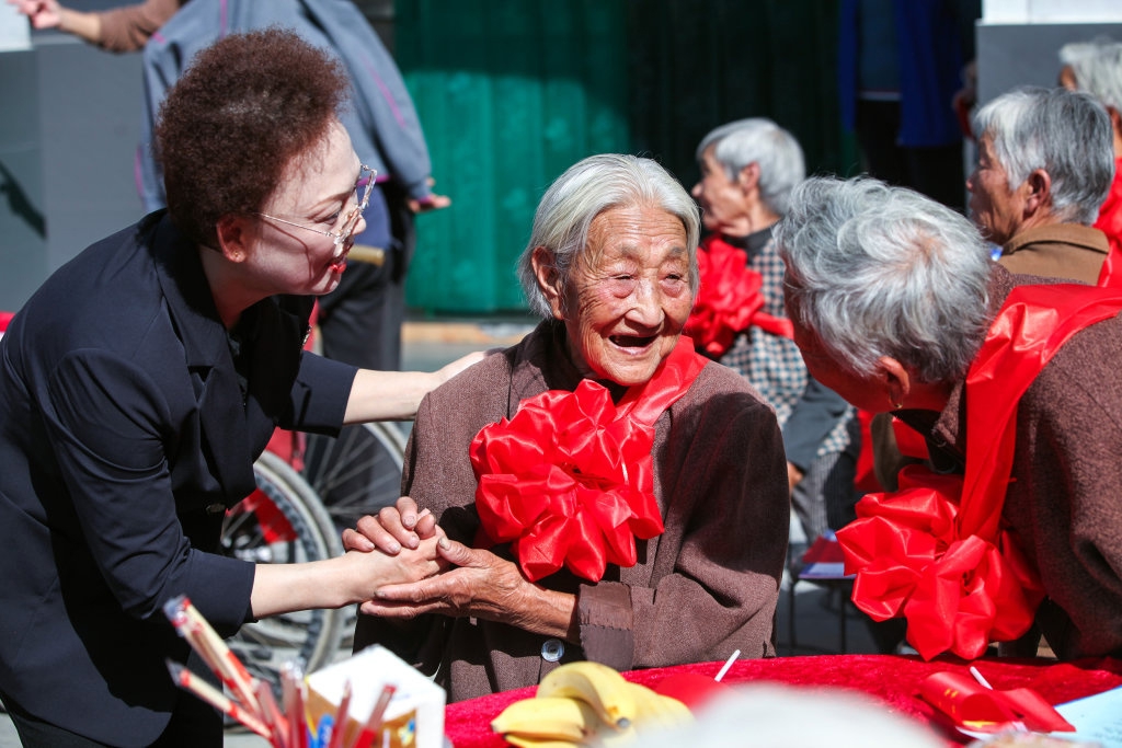 10月10日,在河南省焦作市博爱县许良镇许良村文化广场,志愿者为村里的老人戴上“长寿花”。