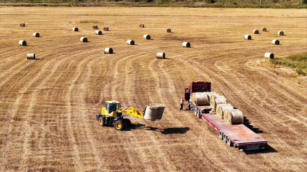 10月10日,在滨州市沾化区海防办事处,工作人员将打捆后的芦苇装车(无人机照片)。