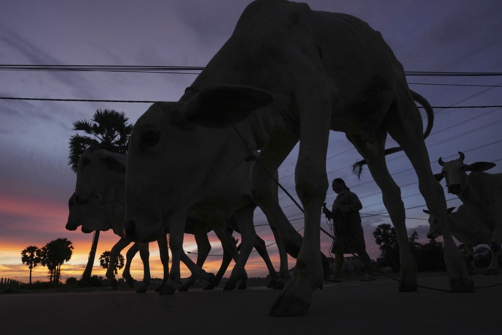 10月10日清晨,在柬埔寨金边附近,一名女子迎着朝霞放牛。