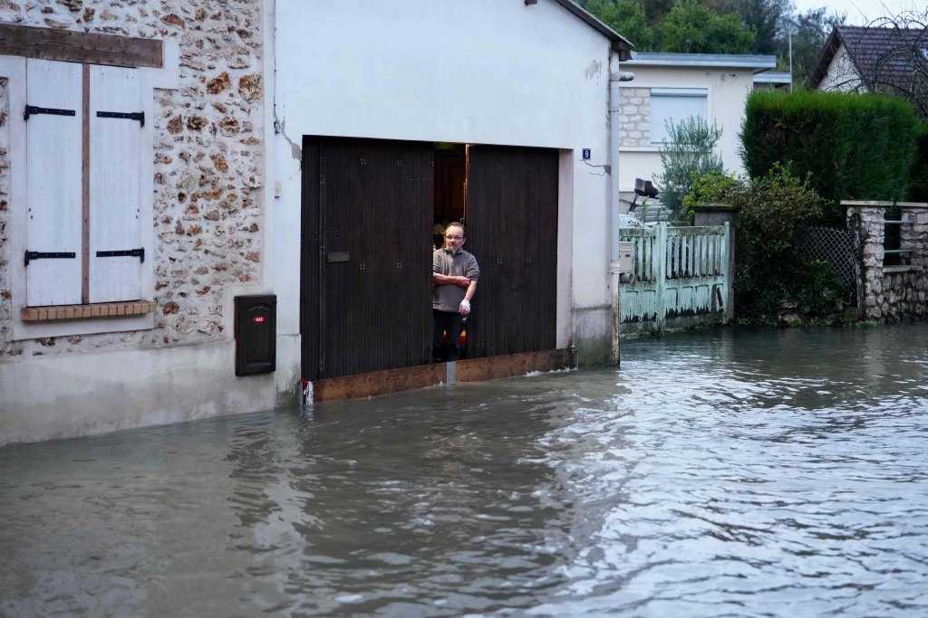 10月10日,在法国塞纳-马恩省,一名居民望向积水的街道。