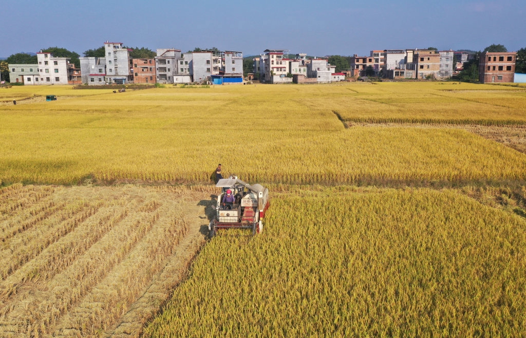 金秋时节,湖南省永州市蓝山县种植的晚稻迎来丰收,当地村民抢抓农时,收割水稻、晾晒稻谷。据介绍,蓝山县今年种植晚稻面积12.97万亩。