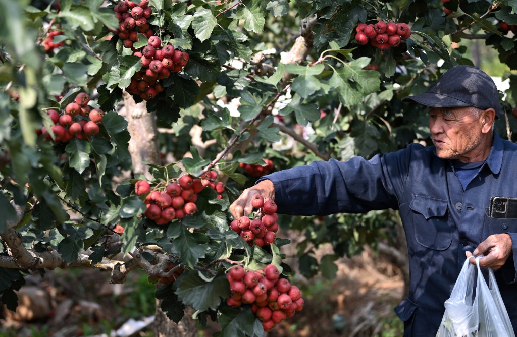10月12日,在天津市蓟州区马伸桥镇育英洼村,村民在采摘山楂。