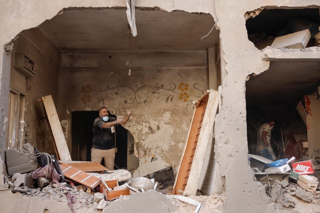 10月11日,在黎巴嫩首都贝鲁特,人们站在被以军袭击毁坏的房屋废墟上。