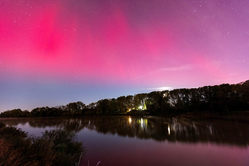 这是10月10日晚在加拿大安大略省喀里多尼亚附近拍摄的北极光。