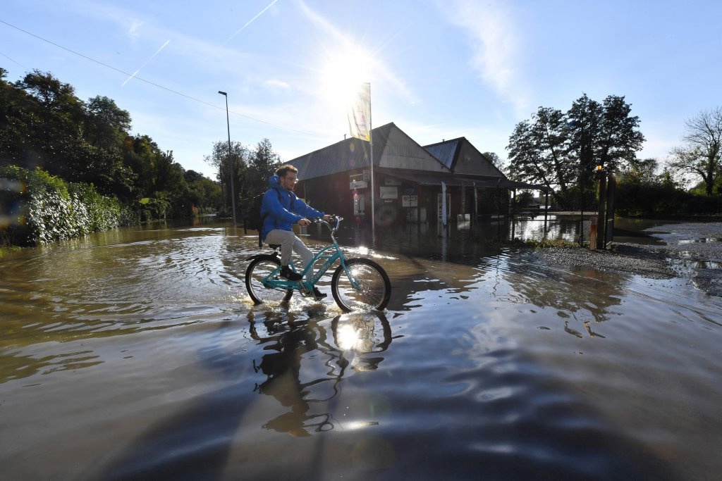 10月11日,在法国中部的沙托丹,一名男子骑行在被水淹没的街道上。