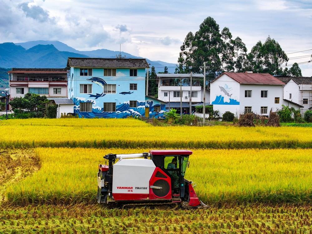 10月11日,四川在线记者在五宪镇的荥经县粮经复合现代农业园区抬头一望,鸟儿在金黄稻田上盘旋低飞。收割机缓缓经过一片稻田,所到之处,一茬茬水稻变成低矮的秸秆,扑面而来是植物刚被切割后的独有清香——作为荥经的传统纯农业镇,五宪镇迎来了一年的丰收季。