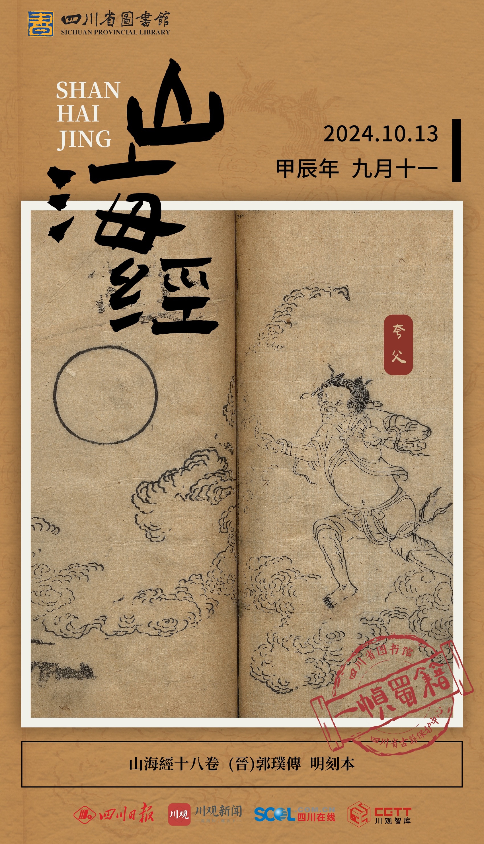 10月13日,一帧蜀籍邀你走进《山海经》中夸父逐日的故事。海报所选用图为《山海经》十八卷 (晋)郭璞传 明刻本。
