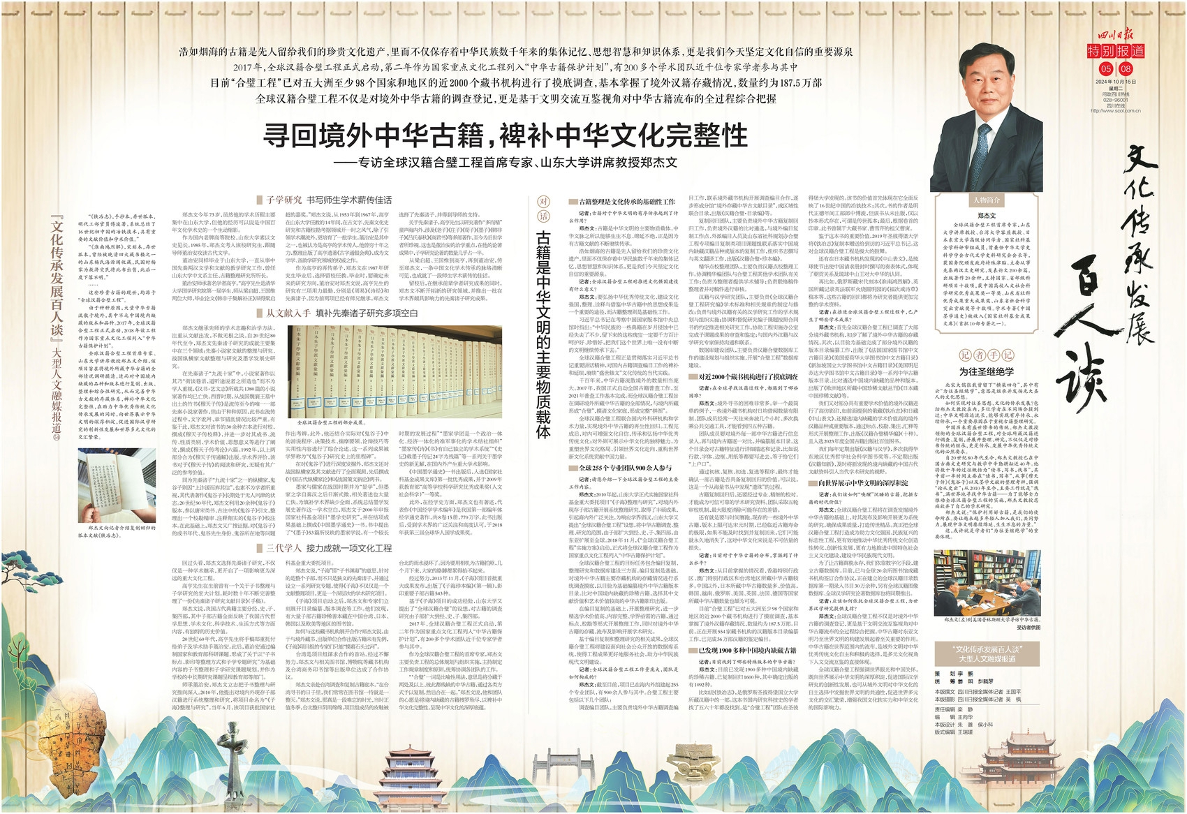 四川日报全媒体“文化传承发展百人谈”大型人文融媒报道持续推出,今日《四川日报》连版推出第五十四期,专访全球汉籍合璧工程首席专家、山东大学讲席教授郑杰文。