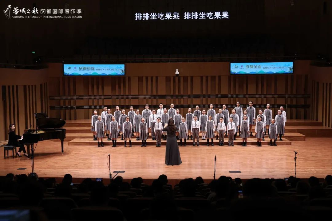 这是新都童声合唱团第一次登上“蓉城之秋”成都国际音乐季系列演出舞台,当晚共8支合唱团带来了《骑马上成都》《月亮光光》《排排坐吃果果》等12首经典成都童谣。 谢迅介绍,与往次演出声光电并用不同的是,这场表演堪称声音“素颜”——没有音响功放,清亮的童声在音乐厅纯然回响,让观众沉浸在动听的原声里。