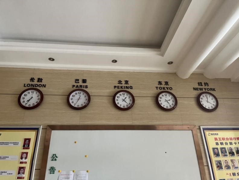 2024年3月27日,义乌某跨境电商园区,跨境电商聚集办公的地点常常装有多个时区的钟表。谢秋伊 摄