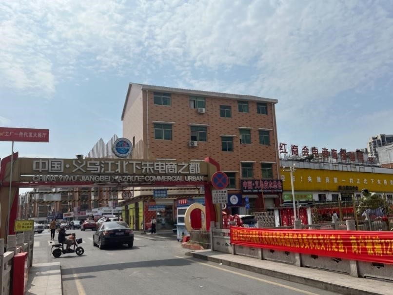 北下朱的每栋五层小楼,通常一层为供应链店面,二层为仓库,三四层用于直播和办公,五层房东自住。早上九点半,村子里只有零星几家底商开门,大部分人半夜下播还在楼上睡觉。2024年3月27日,谢秋伊摄于 义乌江北下朱电商之都