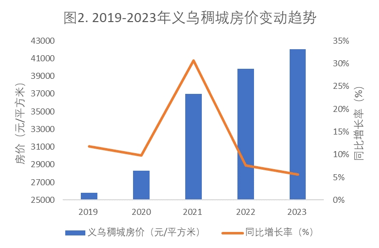 电商“跨境”后,支撑了义乌核心区的房价,对全市资产价格稳定做出了重要贡献。据国家统计局数据,2022年以来,中国房地产价格和成交量受经济结构性和周期性因素影响,面临下跌压力。但是,义乌核心区稠城街道的房价却在疫情间保持了坚挺的涨势(参考图2)。
