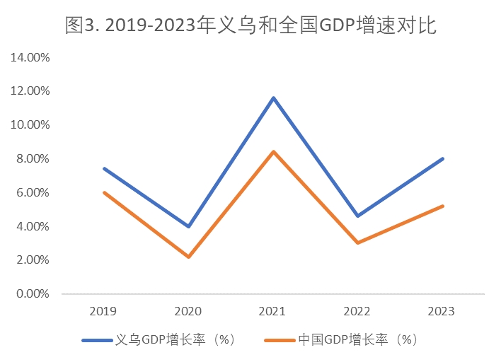 实际上,不仅是房地产,整个义乌的经济都很有韧性。在过去的5年间,义乌的GDP增速始终在全国平均增速之上(参考图3)。2021年义乌GDP增速一度达到11.6%。2024年前三季度,义乌全市实现地区生产总值1607.8亿元,同比增长7.3%,增速居全省“十七强”县(市、区)和金华各县(市、区)第1。这与义乌作为一个外贸核心区,积极拥抱跨境电商的时代机遇不无关系。