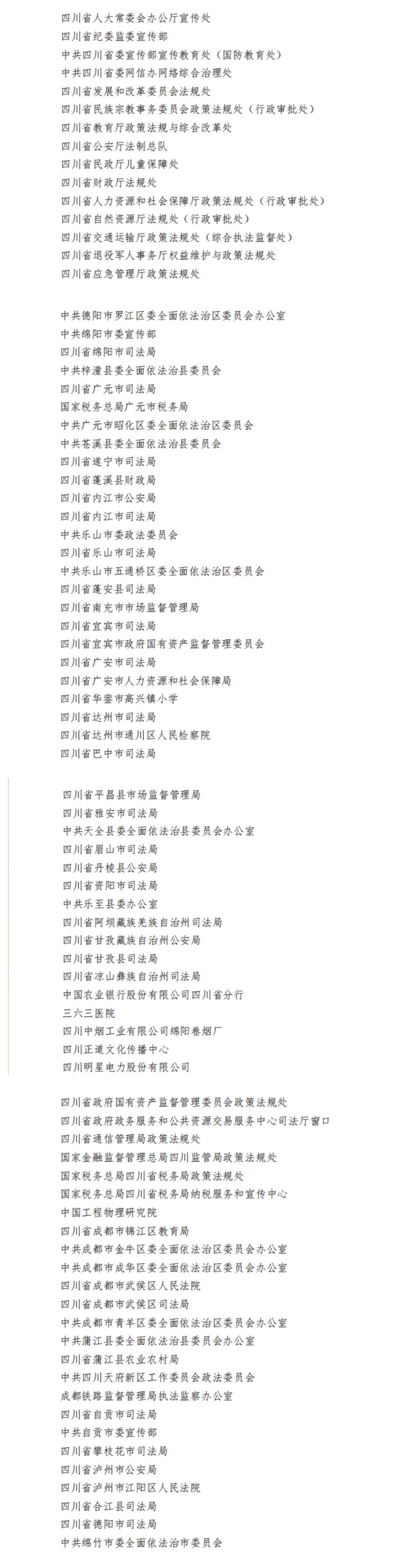 为提高各地、各部门行业开展法治宣传教育的积极性,进一步推动普法依法治理工作深入开展,司法部、全国普法办近日印发《关于通报表扬全国“八五”普法中期表现突出的单位和个人的通知》,对中央纪委国家监委新闻传播中心专题部等1793个表现突出的单位,李庚等1556名表现突出的个人予以通报表扬。其中,四川省有81个单位、65名个人荣获表扬。 具体名单如下: