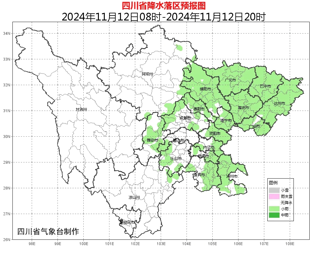 未来三天:12-13日盆地以阴天为主,部分地方有小雨或零星小雨,14日多云间阴天,盆周有分散小雨;川西高原和攀西地区大部以晴间多云天气为主。
