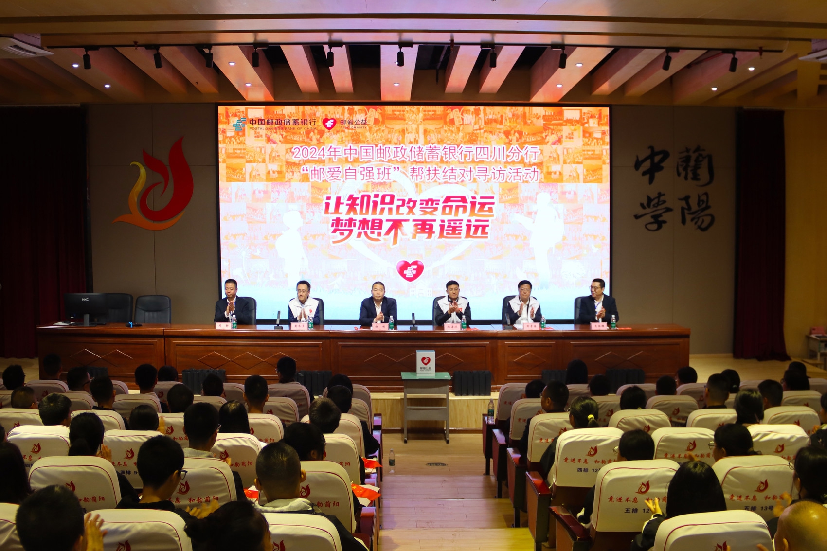 邮储银行四川省分行党委委员、副行长、工会主席邹青春热情洋溢地作讲话,他用“六个字”与学生共勉:一是“立德”,德“立”住了,人才能“树”起来,作为中学生,要树立正确的价值观,今后才能成为对国家、对社会可堪大用之人;二是“立志”,“志不立,天下无可成之事”,同学们登高望远,要脚踏实地,从点滴做起,靠真才实学、真抓实干去实现自己的理想;三是“立行”,学习力是最核心竞争力,同学们要持续学习,才能培养强大而稳定的内核。其次是行动力,“知行合一”简言之就是既要“学”,更要“习”,关键在行动,越努力的人往往越幸运。