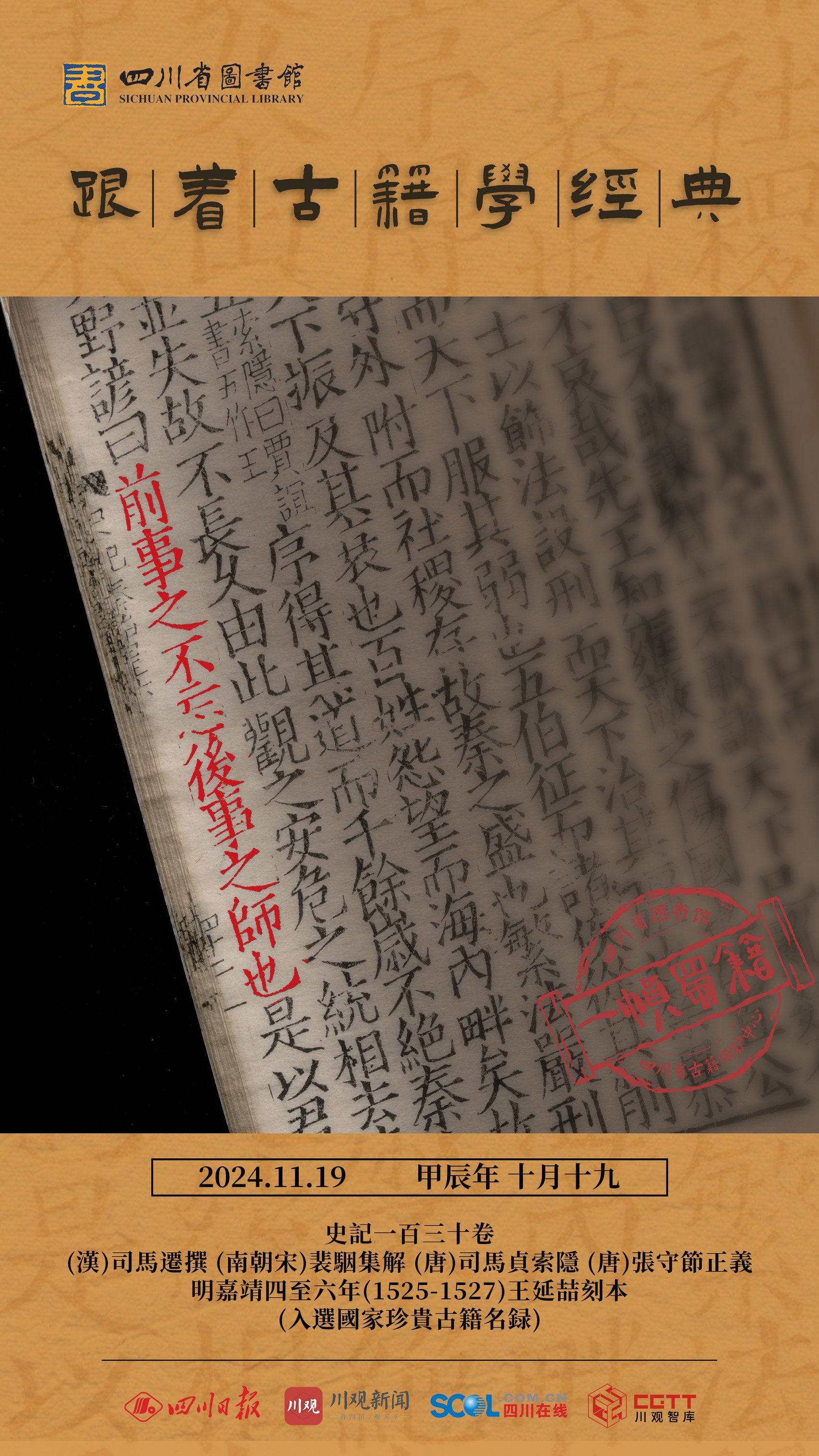 11月19日,一帧蜀籍邀您欣赏《史记》。海报所选用图为《史记》一百三十卷,(汉)司马迁撰(南朝宋)裴驷集解(唐)司马贞索隐(唐)张守节正义,明嘉靖四至六年(1525-1527)王延喆刻本(入选国家珍贵古籍名录)。