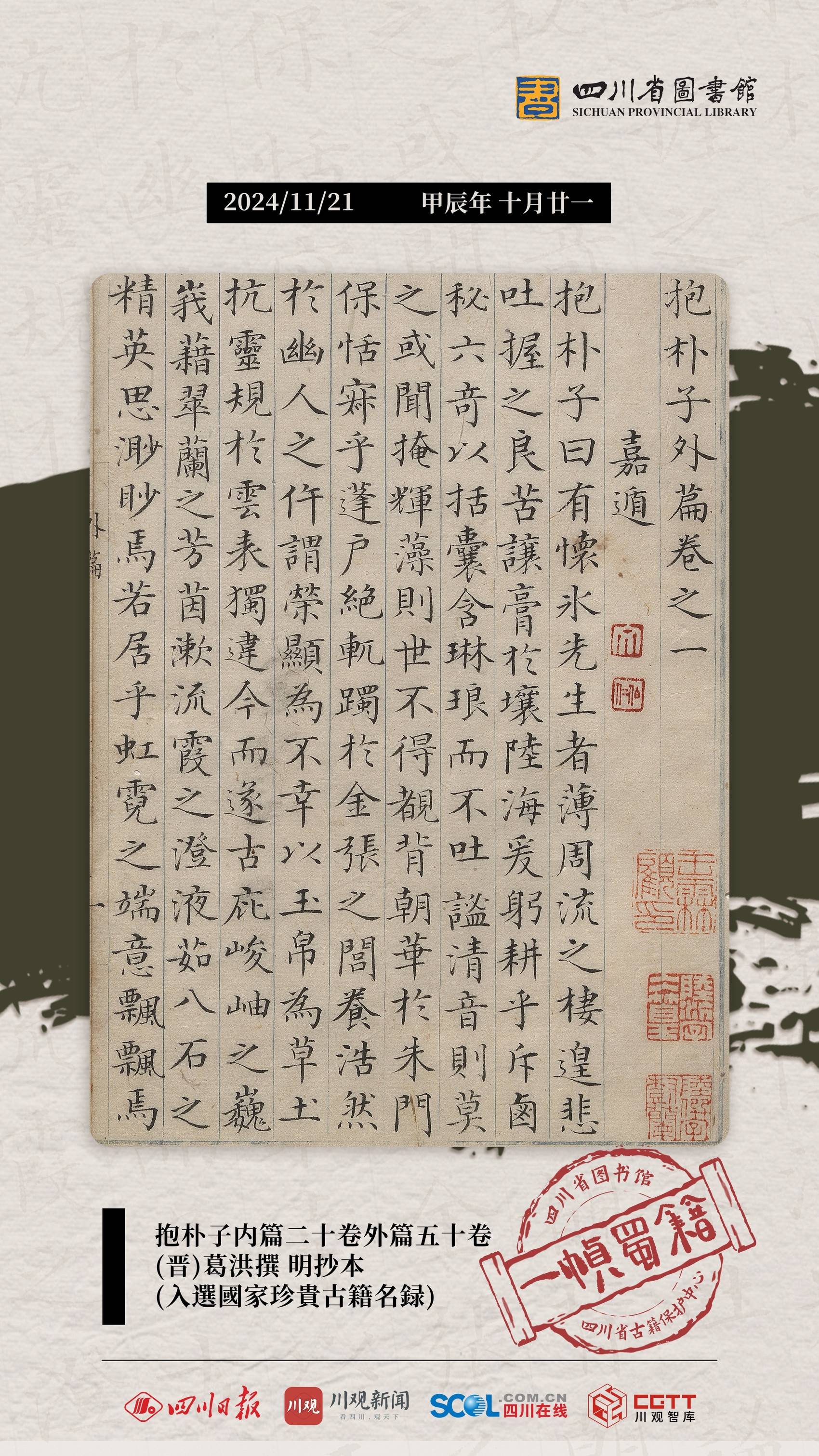 11月21日,一帧蜀籍邀您欣赏《抱朴子》。海报所选用图为《抱朴子》内篇二十卷外篇五十卷,由晋代葛洪所撰写,版本为明抄本(入选国家珍贵古籍名录)。