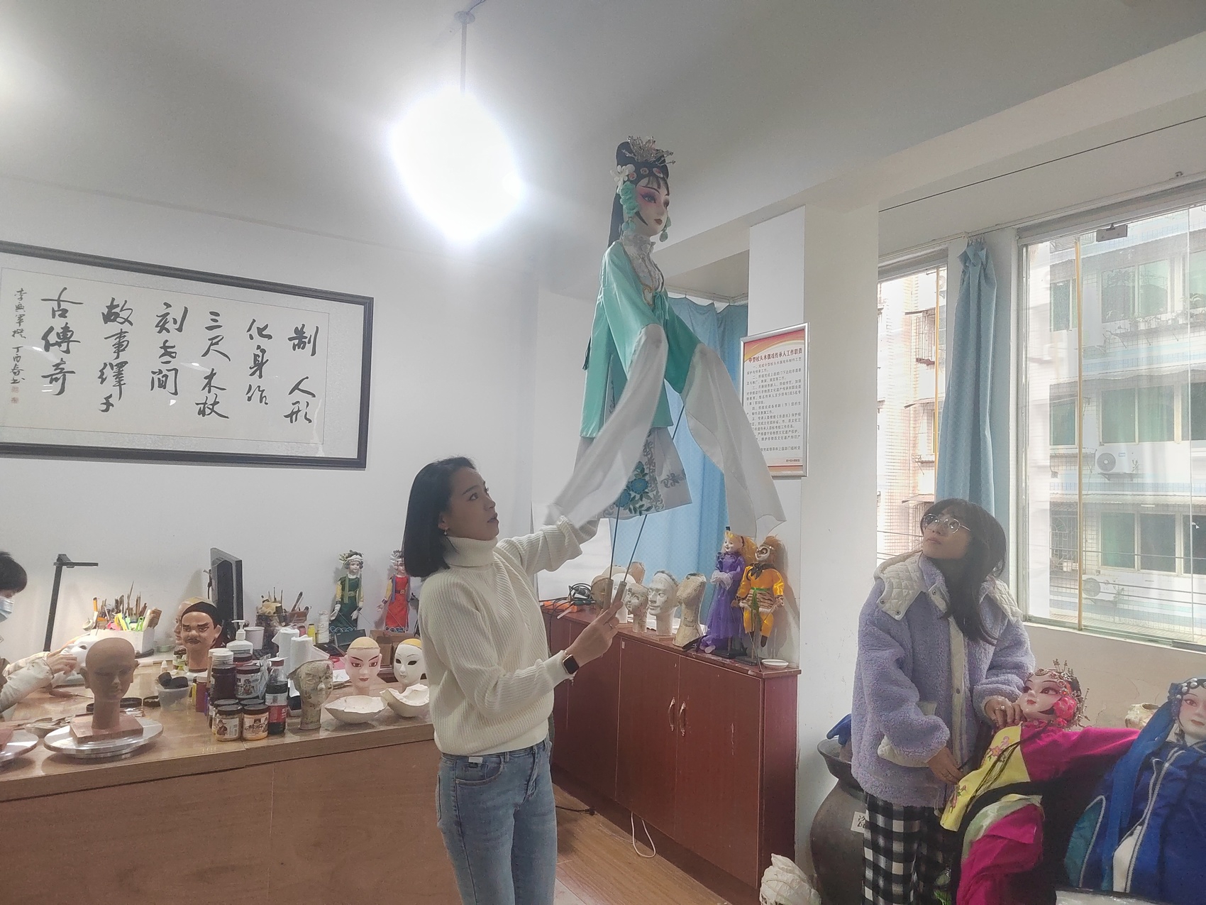 杨武介绍,资中木偶戏为中型杖头木偶戏,起源于清光绪年间,已有百年历史。因其独特的表演形式,2014年被列入国家级非遗保护戏剧扩展性项目名录。表演时,演出者需将木偶举过头顶,操纵撑杆和手扦让木偶完成表演。“要求‘动作准、手腕活’,演员基本功要求很高。”除过中型杖头木偶戏表演,杖头木偶制作也四川省首批非遗代表性项目。而资中木偶剧团就是这两项“非遗”的重要保护传承基地。