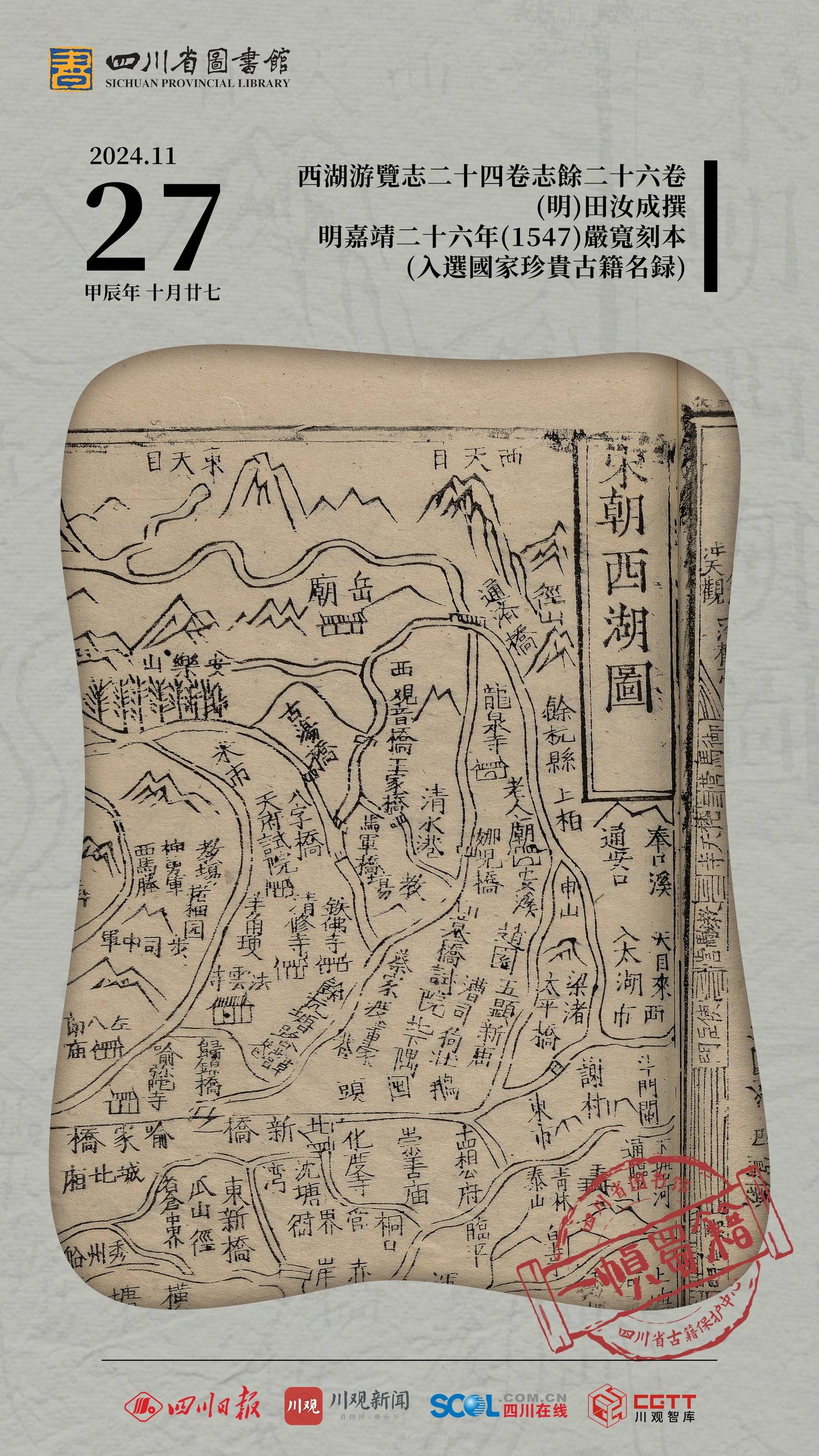 11月27日,一帧蜀籍邀您欣赏《西湖游览志》。海报所选用图为《西湖游览志》二十四卷志余二十六卷,由(明)田汝成撰,明嘉靖二十六年(1547)严宽刻本(入选国家珍贵古籍名录)。
