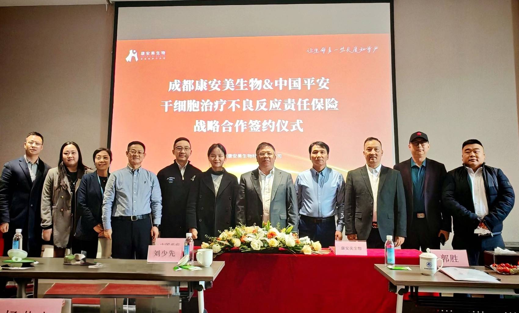 2024年11月26日,在一片热烈的掌声中,成都康安美生物科技有限公司与平安产险重庆分公司在成都医学城三医创新中心正式签约,共同在四川省内推出首个干细胞治疗不良反应责任险。这也标志着干细胞治疗不良反应责任险在川渝地区正式上线。