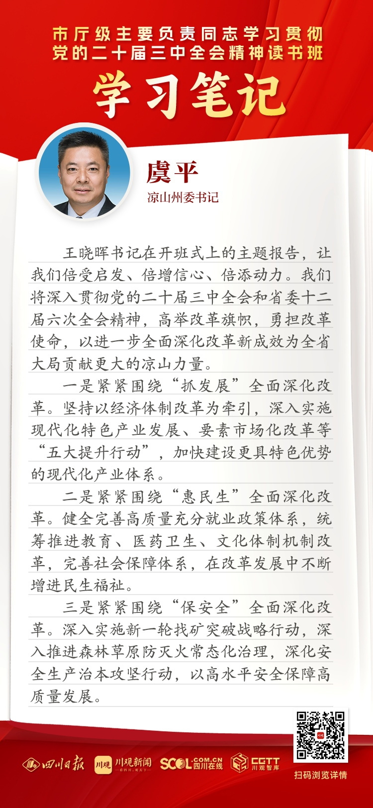 王晓晖书记在开班式上的主题报告,让我们倍受启发、倍增信心、倍添动力。我们将深入贯彻党的二十届三中全会和省委十二届六次全会精神,高举改革旗帜,勇担改革使命,以进一步全面深化改革新成效为全省大局贡献更大的凉山力量。