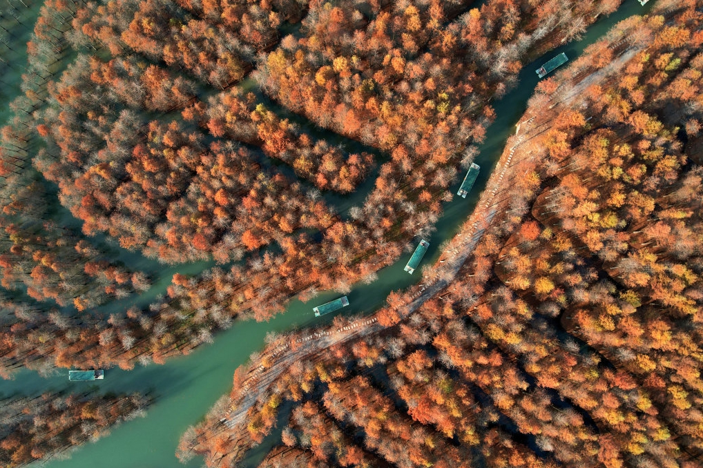 初冬时节,安徽省宣城市宁国市方塘乡的2000余亩红杉林层林尽染,进入一年中最美的时节,游客泛舟水上,宛若在画中游览。