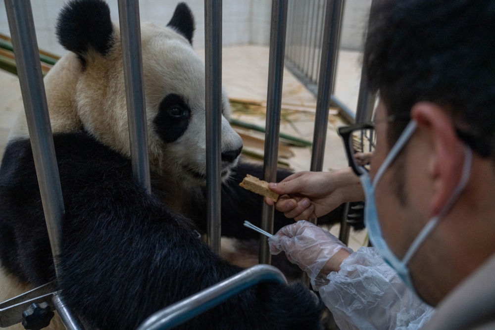 12月4日上午,兽医在采集大熊猫“福宝”的口腔拭子做进一步检测。