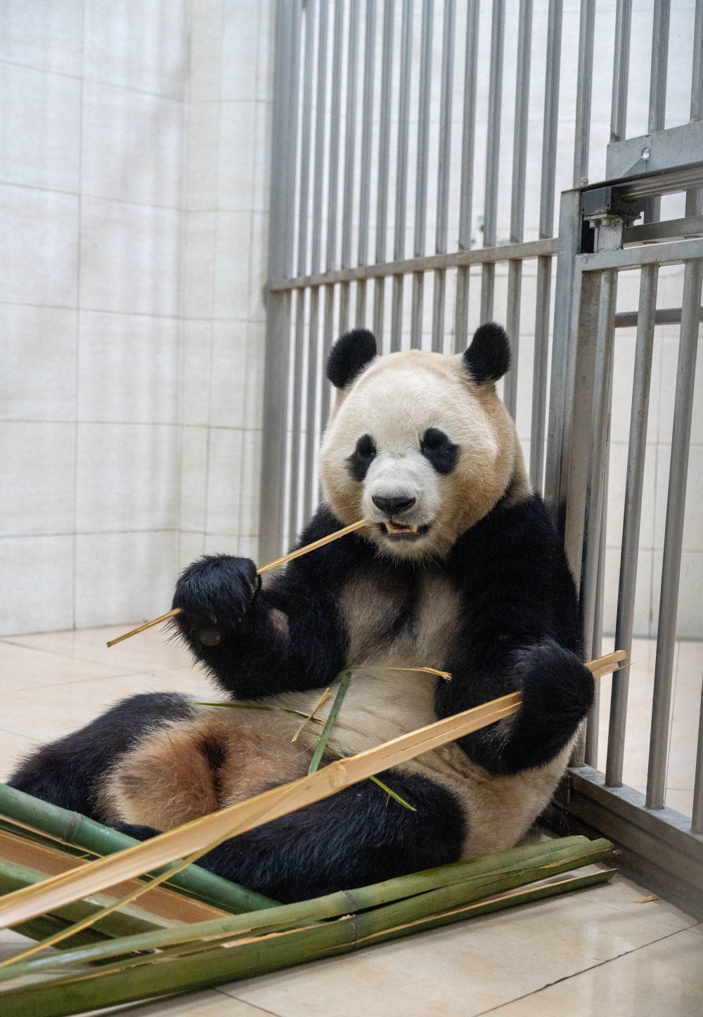 12月4日上午,大熊猫“福宝”在吃竹子,进食过程中未出现发抖行为。