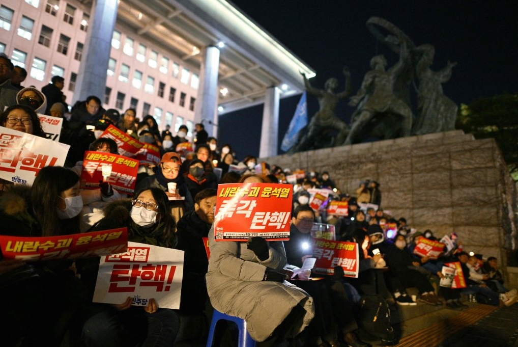 12月4日,韩国民众在首尔的国会大厦台阶上参加抗议活动,要求总统尹锡悦辞职。韩国多个在野党4日下午向国会发起针对总统尹锡悦的弹劾动议案。