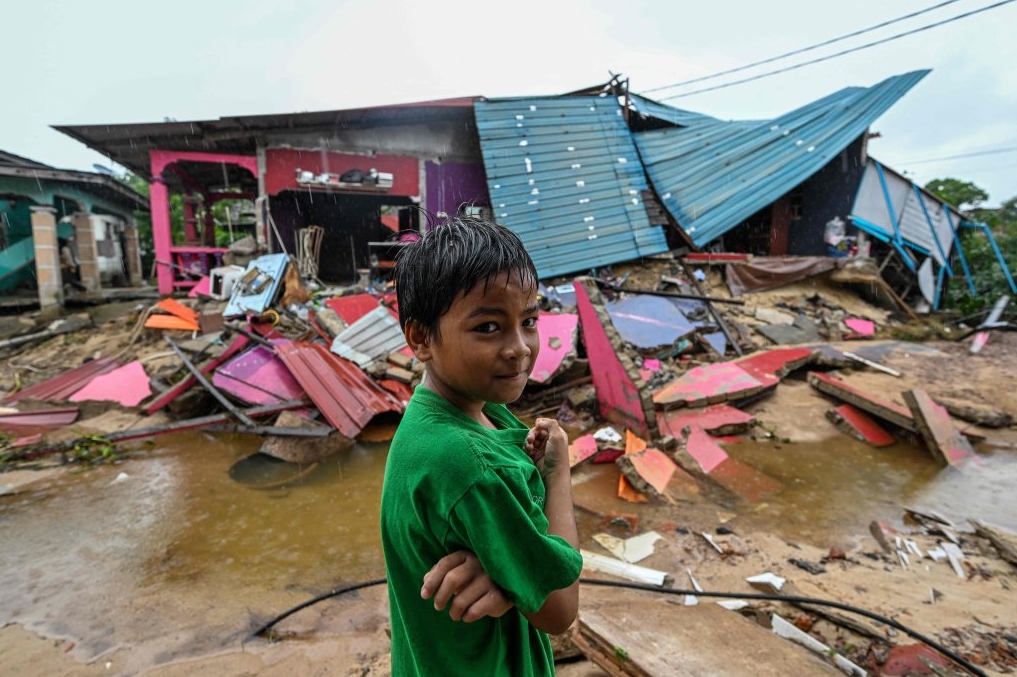 12月4日,在马来西亚吉兰丹州道北,一名男孩站在被洪水破坏的房屋前。马来西亚东海岸多地上周开始遭遇连续强降雨并引发洪灾。