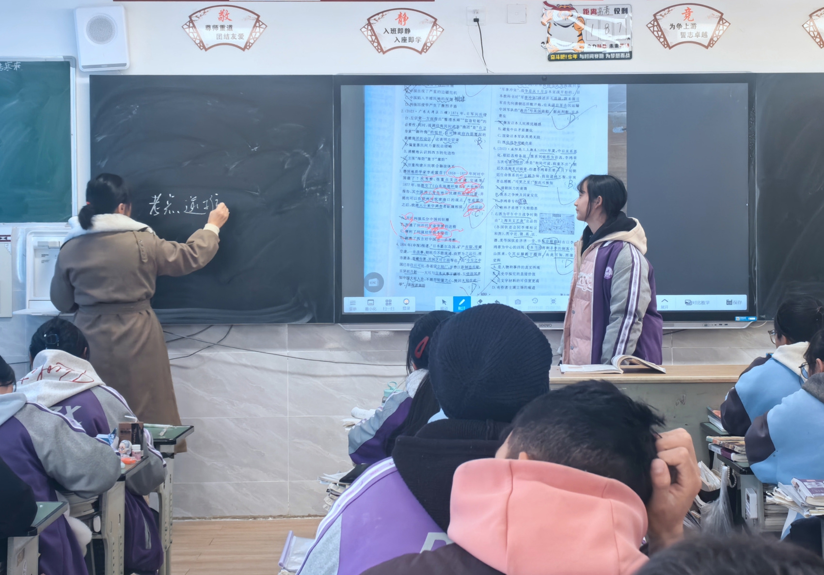 “这道题,我用排除法,排除了ABC选项,但为什么要选D,我也不是很明白,还要请何老师给我们讲解一下。”讲到第六题时,柏莉红向坐在教室最后一排的老师何娅求助,何娅随即走上台,解答了柏莉红的疑问。