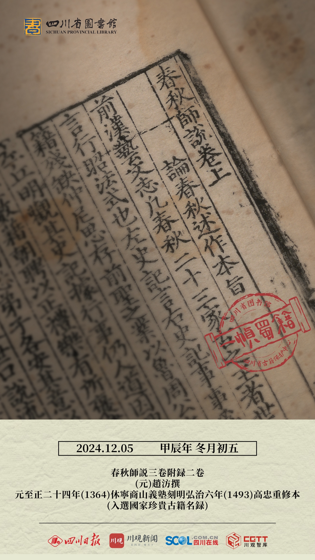 12月5日,一帧蜀籍邀您欣赏《春秋师说》。海报所选用图为《春秋师说》三卷附录二卷,由(元)赵汸撰,元至正二十四年(1364)休宁商山义塾刻,版本为明弘治六年(1493)高忠重修本(入选国家珍贵古籍名录)。
