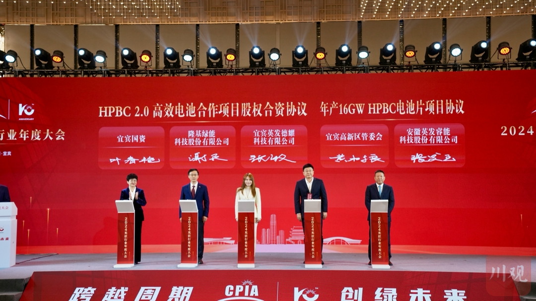 大会开幕式上,光伏电池新技术生产线落地宜宾。宜宾市人民政府、宜宾市国资委和宜宾高新区管委会,分别与中国光伏行业协会、光伏行业企业签署协议,围绕复合钝化背接触电池技术展开合作。