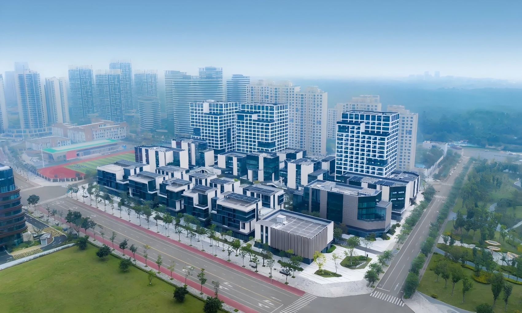 穿过红梁湾生态公园,便来到兴隆湖科技融合转化基地,形态各异的载体建筑林立,构建出园区独具一格的外貌。