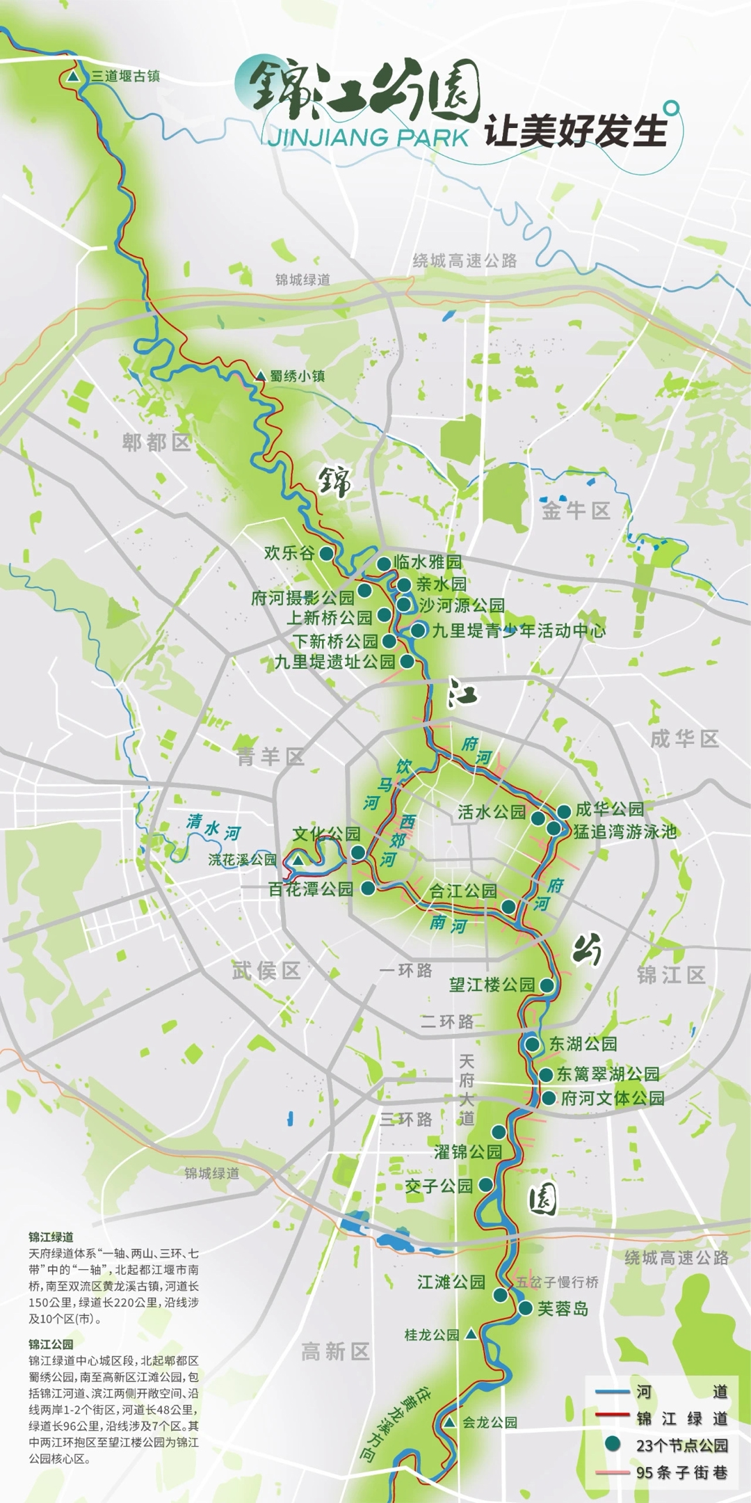 自2018年以来,成都市大力实施锦江水生态治理和锦江绿道建设。目前,220公里锦江绿道已基本贯通,新增滨水开敞空间15万平方米,改造和新建23个重要节点公园、11条滨水慢行街区,5座慢行桥、12个码头,综合整治95条子街巷,实现锦江20公里通航,开通运营“夜游锦江”9条航线。