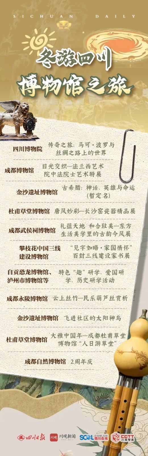 冬游四川,线路更“精彩”,甄选打造10条“串珠成链”的精品线路,此生必达的“玄关秘境”等您“解锁”。精选整合五大自然和文化遗产以及各类优势资源,推出10条全新的精品旅游线路,让您一次看个够,精彩不容错过。冬游四川,“南方小土豆”在家门口就能见识冰天雪地、银装素裹,尽情享受冬日自然生态之美、多彩人文之韵:世界遗产经典之旅、萌宠大熊猫生态之旅、雪山彩林小西环线之旅、冰雪奇缘之旅、寻觅香格里拉之旅、《黑神话·悟空》取景地打卡之旅、烟火成都City Walk之旅(城市漫步)、“双城记”巴蜀探秘之旅,总有一款适合您!