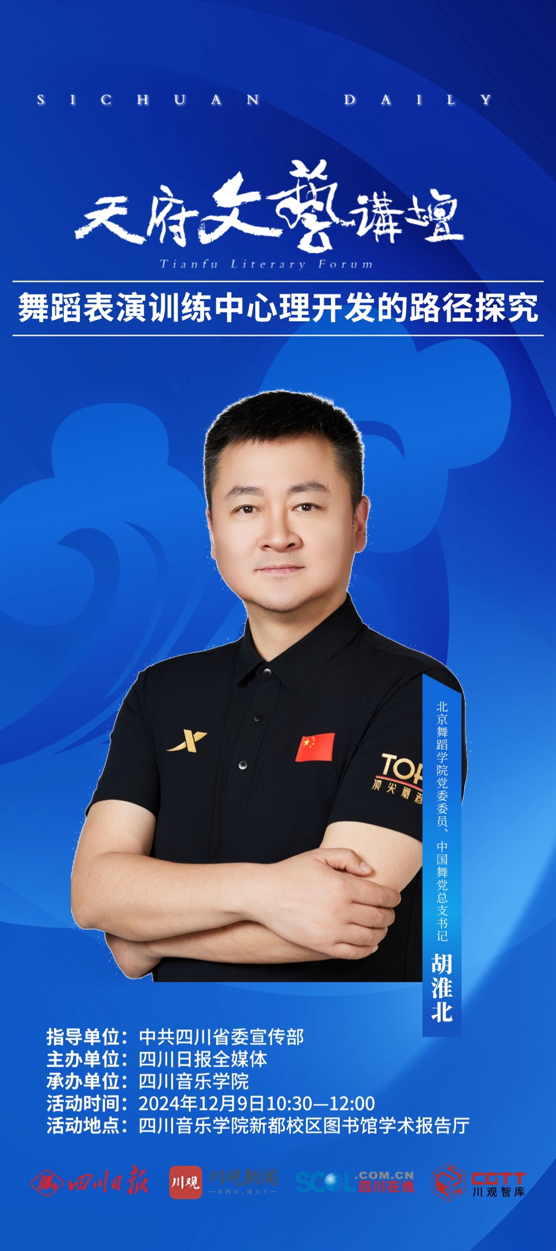 12月9日,在2024“中国顶尖舞者成长计划”全国作品展演(个人组)举行之际,由四川省委宣传部指导、四川日报全媒体主办、四川音乐学院承办的“天府文艺讲坛”将在四川音乐学院新都校区与观众见面。北京舞蹈学院党委委员、中国舞党总支书记、中国古典舞系主任胡淮北将做客“天府文艺讲坛”,以“舞蹈表演训练中心理开发的路径探究”为主题展开分享。