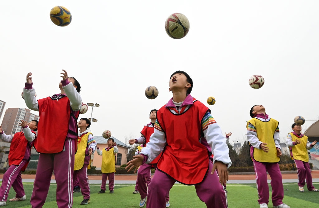 12月9日,河北省邯郸市峰峰矿区外国语实验小学学生进行足球训练。