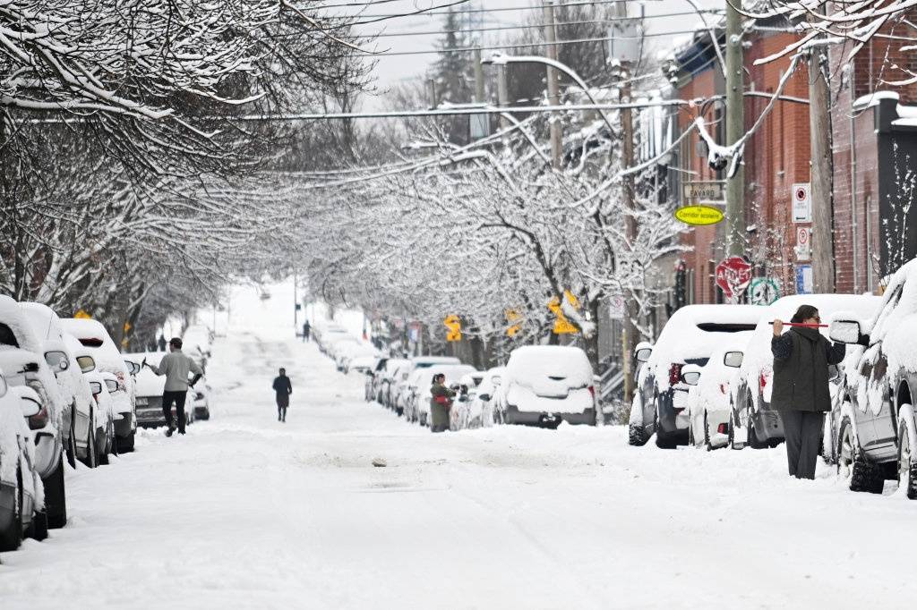 12月8日,人们在加拿大蒙特利尔清理车辆上的积雪。