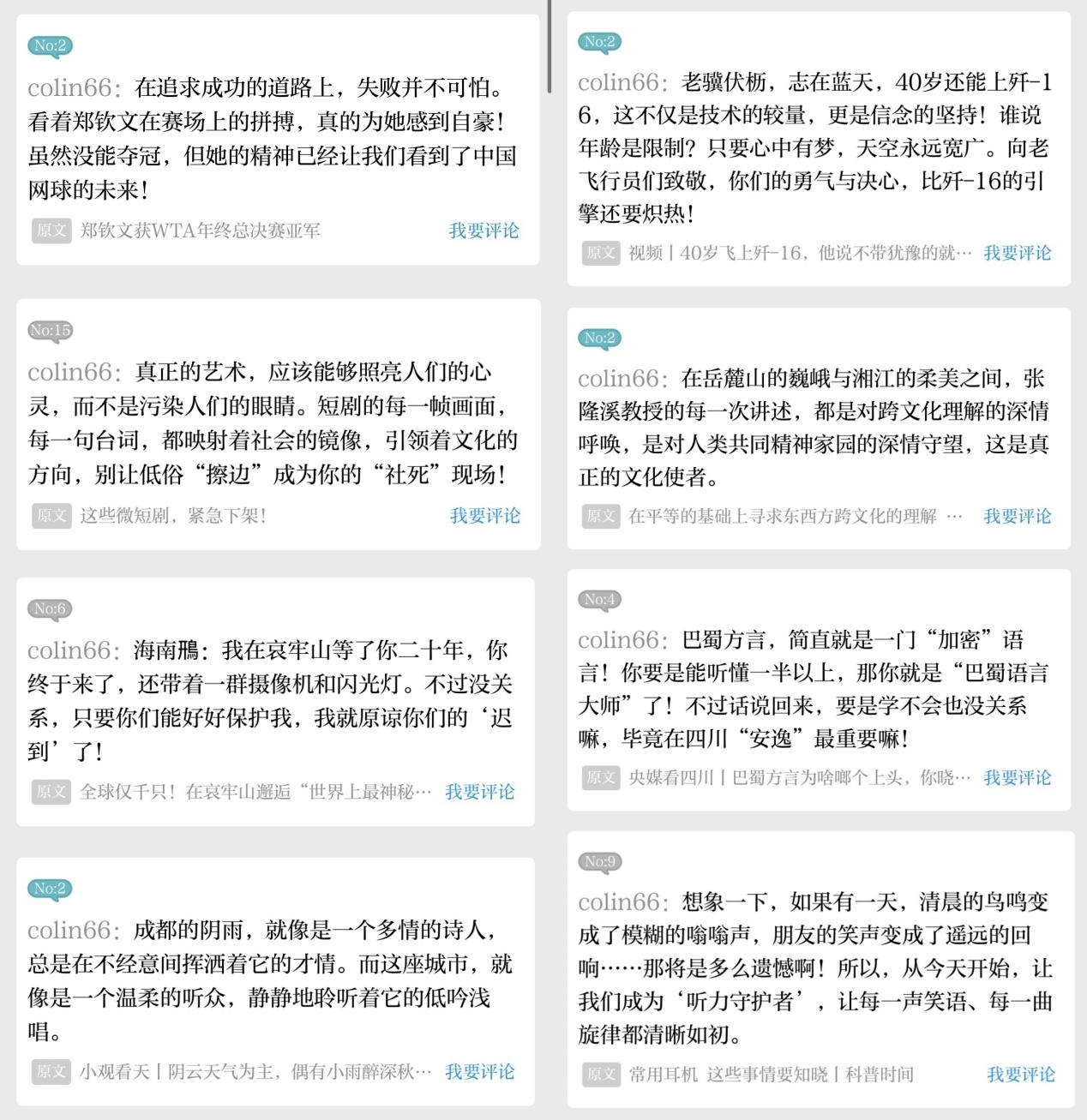 (“colin66”每日悦评榜部分上榜评论)