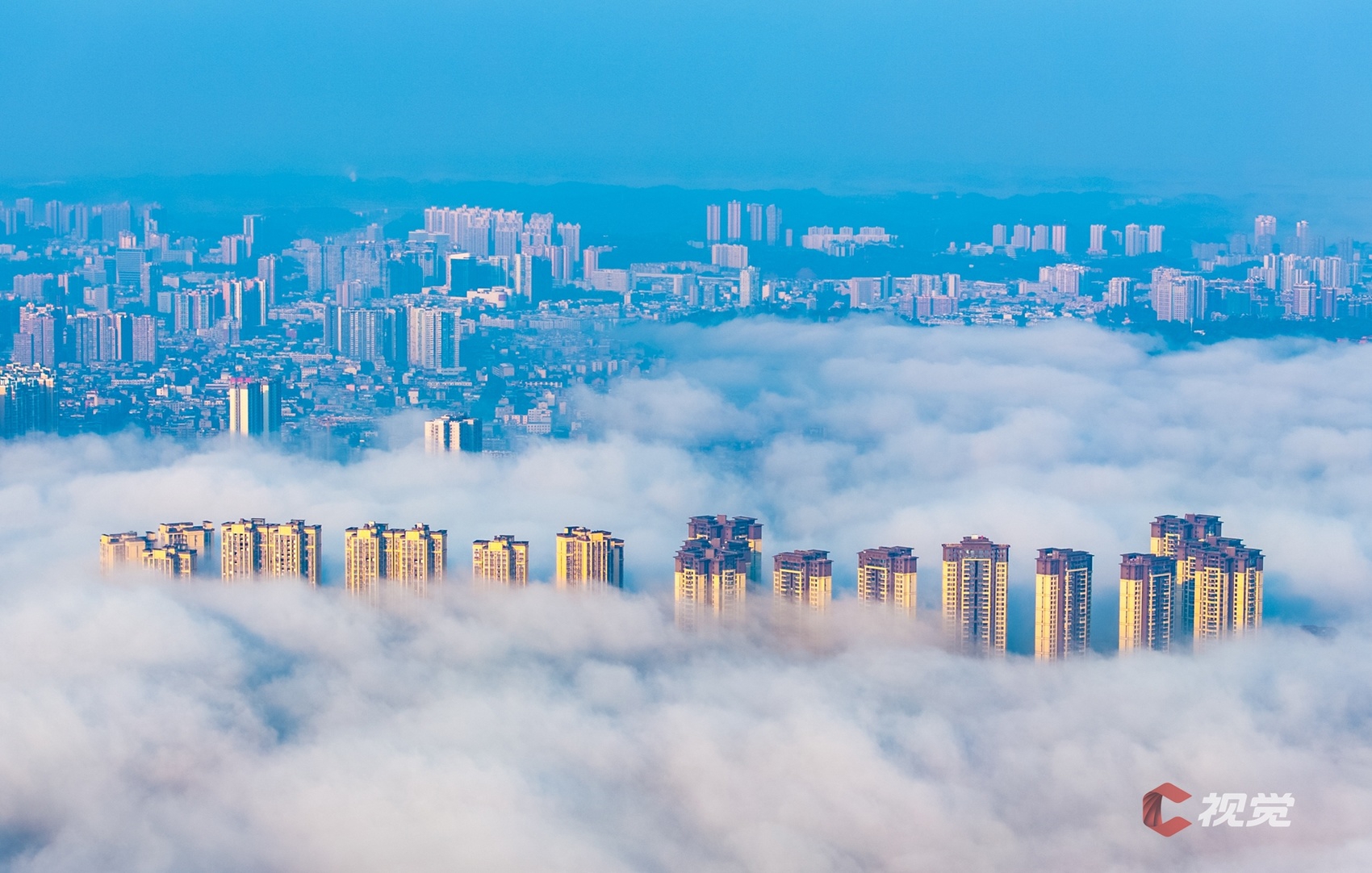 12月11日,资阳市城东新区、安岳等地雨后初晴,城区高楼、沱江、字库山公园以及奔驰的高铁在缥缈的晨雾中若隐若现,随着朝阳升起,金色光辉洒下,宛如“天空之城”。