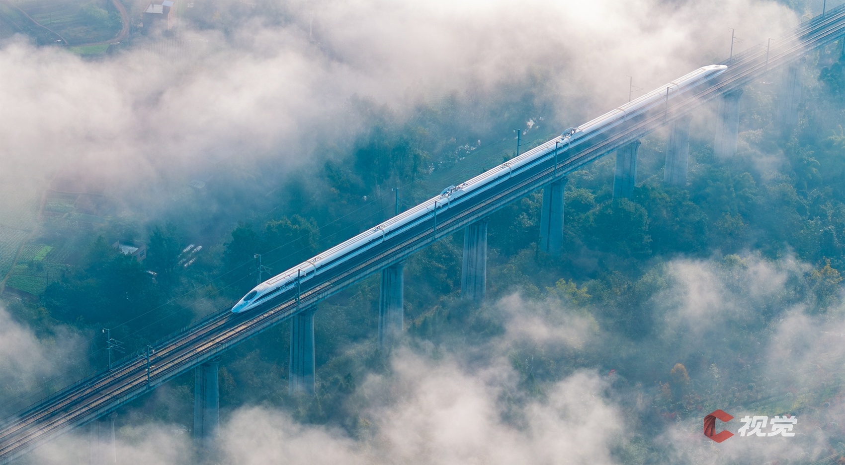 资阳市城东新区,一列动车在云雾飘渺中驶过。C视觉摄影师 张天富
